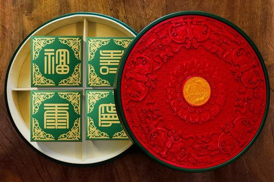 2021年的中秋節(jié),劉博聞做出了一件新的作品。作品是一個月餅盒,名為《三兔抱月圓盒》。圓盒采用雕漆工藝,其上通過機器雕刻有蓮花、祥云、蝙蝠、玉兔等圖案,畫面整體布局穩(wěn)重大方,顏色搭配巧妙而大膽。劉博聞介紹說,盒為圓形代表“團圓”,盒上的五只蝙蝠寓意“五福臨門”,盒子以紅色為主色寓意“喜慶歡樂”,盒中央黃色圓月搭配三兔抱月寓意“天倫之樂,玉兔報喜”,盒內(nèi)四塊月餅組成方形,圓里有方,寓意“孔方為錢,四方來財”。劉博聞?wù)f,大多數(shù)人欣賞一件雕漆作品,一看雕工,二看寓意,過硬的手藝搭配上精心設(shè)計的寓意就能夠出好的作品,而在當(dāng)下更為重要的,是將作品的實用性與藝術(shù)性相結(jié)合?!斑@個盒子可以用來裝月餅,同時也具有儲物功能。既有觀賞性、藝術(shù)性,也有實用性。我認為傳統(tǒng)工藝品既需要繼承傳統(tǒng)的技藝精髓,也要靈活使用先進的技術(shù)和生產(chǎn)力來適應(yīng)當(dāng)今的社會發(fā)展,讓作品不僅僅可以用來看,也要能用。讓老百姓不僅喜歡,也要買得起?!?/p>