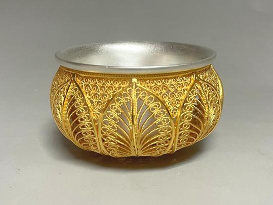 如果用如此細的金屬絲制作花絲尚可通過勤練習(xí)得,那么將已經(jīng)掐出形狀的不同種類的花絲焊接成各式紋樣圖案,終拼接組合成一件精巧的擺件器物,便無疑可稱之為“絕技”了。董瑞京用焊槍對著案臺上的一縷花絲點著了火,僅僅不到5秒的時間,那縷花絲便化作了“銀珠”,“做了這么多年的花絲,難的就是這個。焊接時的火候掌握不好,花絲就會化,因為它太細了。如果是做一個碗或是一個盤子,一旦焊化,也就前功盡棄了?!倍鹁┱f,想掌握“絕技”就要沉得下心,靜得住氣,想要做出好作品,需要心細、手細。
