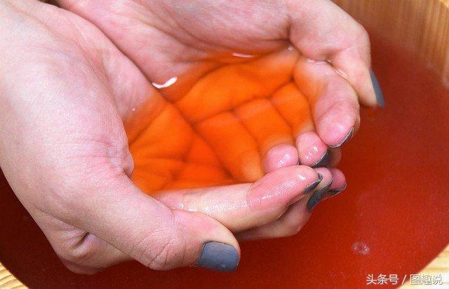 一旦與溫水接觸,雞槌開(kāi)始溶解,細(xì)小的二氧化碳?xì)馀菥蜁?huì)產(chǎn)生油炸的感覺(jué)。溫水隨之變成橙紅色,就像用過(guò)的油一樣。吊詭的是,散發(fā)出來(lái)的氣味,也是KFC秘方炸雞腿的氣味哦!