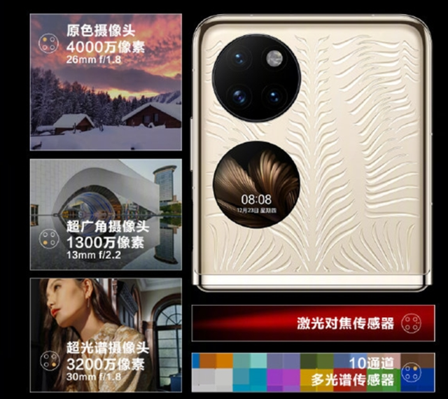 在影像方面,華為P50 Pocket后置配備了4000萬像素的主攝、1300萬像素超廣角以及3200萬像素的超光譜攝像頭,其中超光譜攝像頭能夠捕捉人眼看不到的色彩,可以拍攝出人眼看不到的色彩,拍攝出夢幻的感覺。