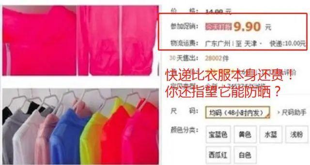不過(guò)市面上,現(xiàn)在各種便宜的防曬衣應(yīng)有盡有,甚至,快遞費(fèi)都比衣服貴了,你指望這防曬衣有用?很多其實(shí)就是薄外套,并不具備防曬功能的。