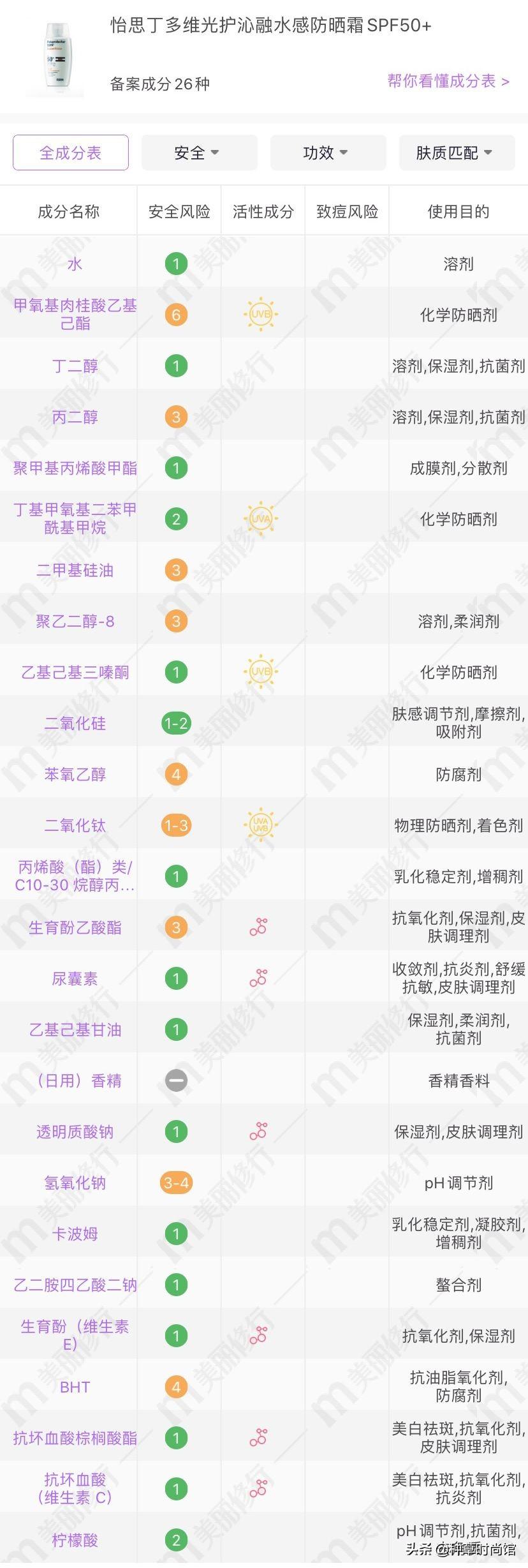 怡思丁防曬指數(shù)為SPF50,不含酒精,敏感肌也可以用。物理防曬成分二氧化鈦,含量比較少,所以不會泛白。里面添加了尿囊素、維E、維C,含量比較低,果就just so so ~
