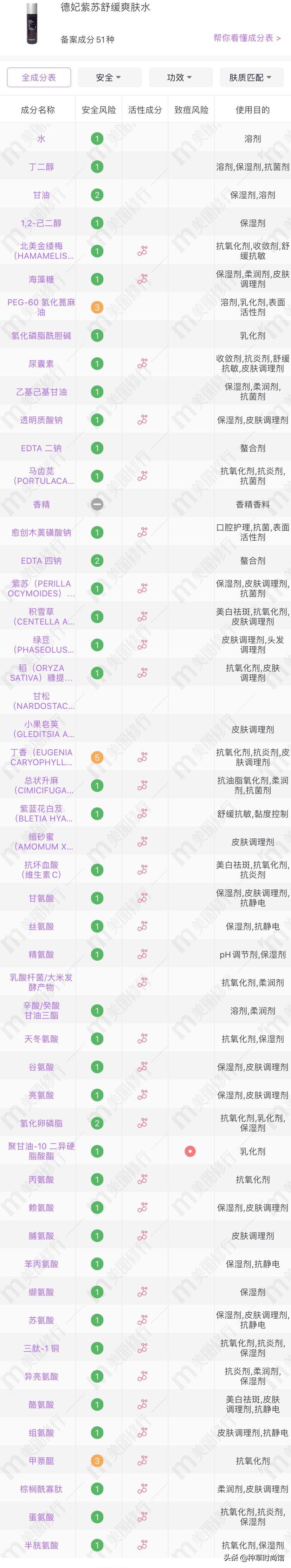 德妃紫蘇水乳成分表里,都是一些耳熟能詳?shù)某煞?,金縷梅、馬齒莧、紫蘇、積雪草,這些都能有的抗炎、鎮(zhèn)定肌膚,比較適合油痘肌。