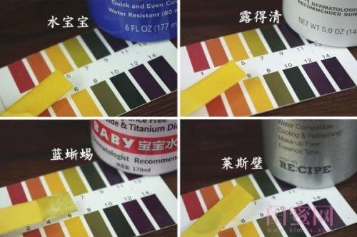 圖中對比色卡可見,四款防曬噴霧的PH值都在6~8之間。親膚,可以放心使用。