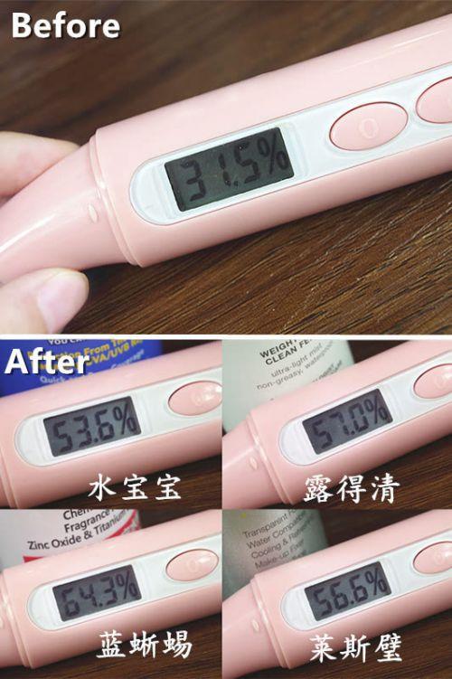 分別使用四款防曬噴霧,來看一下手背肌膚的含水量。使用藍蜥蜴之后,手被肌膚含水量翻倍提升至64.3%,補水果為佳。接下來是露得清和萊斯璧,都將手背肌膚含水量提升至57%左右。而水寶寶果也不錯,使用它之后,手背肌膚含水量為53.8%。