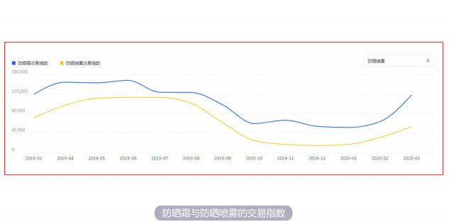 防曬產(chǎn)品的銷售也與季節(jié)聯(lián)系緊密,進口防曬和國產(chǎn)防曬在不同渠道占據(jù)各自優(yōu)勢。生意參謀數(shù)據(jù)顯示,過去一年中(2019.3-2020.3),3至8月期間防曬產(chǎn)品交易指數(shù)高,同時在搜索人氣、搜索熱度、交易指數(shù)等指標(biāo)上,防曬霜要高于防曬噴霧。