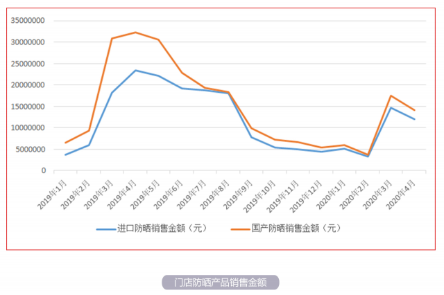 美得得服務(wù)的1.3萬家化妝品門店的數(shù)據(jù)則顯示,今年1-4月門店防曬產(chǎn)品銷售額同比大幅下滑41%。國產(chǎn)防曬銷售金額要高于進口防曬,旺季時兩者差距更加。