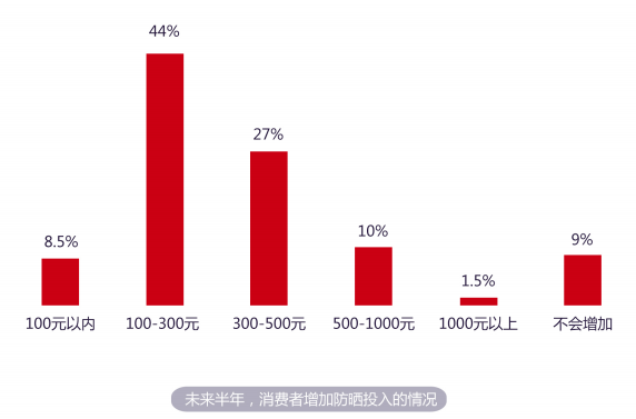 不過,《防曬產(chǎn)品市場調(diào)研報告》顯示,9成消費者表示未來半年會增加在防曬產(chǎn)品上的投入,44%的表示會增加100-300元。
