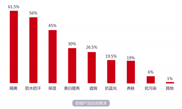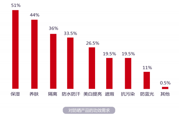 而除了防曬這一基礎(chǔ)功能外,51%的消費者還很注重防曬產(chǎn)品的保濕功,44%的消費者則看中養(yǎng)膚功。也就是說,單一功的防曬產(chǎn)品已無法滿足更多消費者的需求。