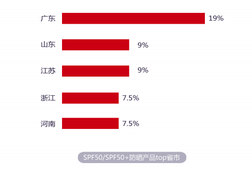 報告顯示,30.5%的消費者購買了防曬系數(shù)SPF30的產(chǎn)品,26.5%的購買了SPF50或SPF50+的防曬產(chǎn)品,47.5%的購買“PA+++”(PA表示防護長波紫外線的能力,“+”字越多,防御果越好)的防曬產(chǎn)品,消費者并不過度追求高防曬倍數(shù)的產(chǎn)品。從報告來看,沿海地區(qū)消費者相對更偏好高倍數(shù)的防曬產(chǎn)品,19%的廣東消費者選擇了SPF50/SPF50+的防曬產(chǎn)品。