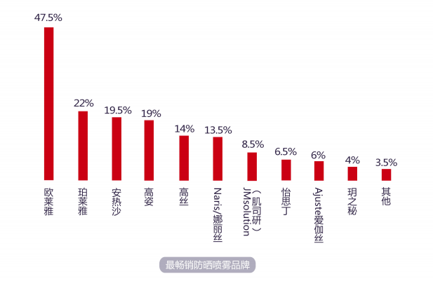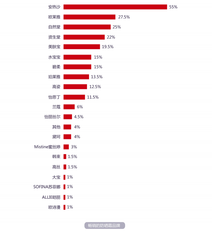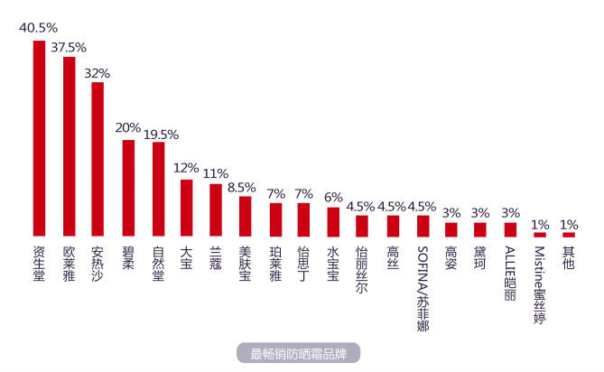 分品牌來看,報告顯示,有40.5%的消費者購買了資生堂的防曬霜,緊隨其后的是歐萊雅和安熱沙。進口品牌防曬霜占據(jù)了前三席。