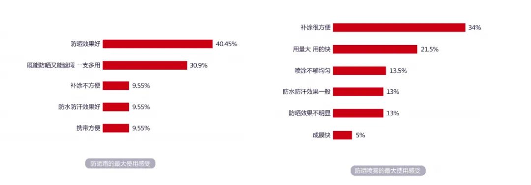 對于防曬霜和防曬噴霧的使用感受,消費者也有不同側(cè)重點。40.45%的消費者認(rèn)為防曬霜的果好,34%的消費者認(rèn)為防曬噴霧補涂方便。
