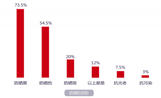值得一提的是,從使用防曬品的目的來看,73.5%的消費者主要希望防曬黑,其次是防曬傷,僅7.5%的人希望通過防曬抗光老化。同時,僅有不足3成的消費者有全年使用防曬產(chǎn)品的習(xí)慣。