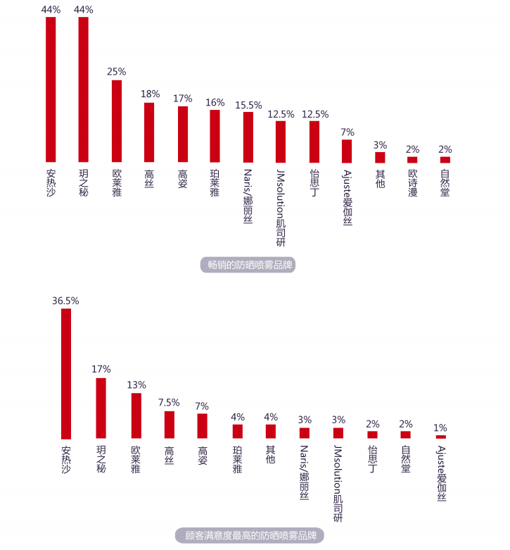 就防曬噴霧而言,有44%的BA表示銷售多的是安熱沙和玥之秘的防曬噴霧,活躍的品牌還包括歐萊雅、高絲、高姿、珀萊雅等。不過,門店顧客仍對安熱沙防曬噴霧滿意。