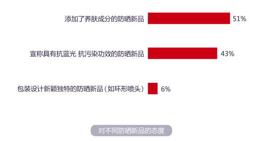 從報告來看,51%的消費者對添加了養(yǎng)膚成分的防曬新品更感興趣,43%的對宣稱具有抗藍(lán)光、抗污染的防曬新品表現(xiàn)出興趣。從這點來看,一些新功正在被市場逐步接受。