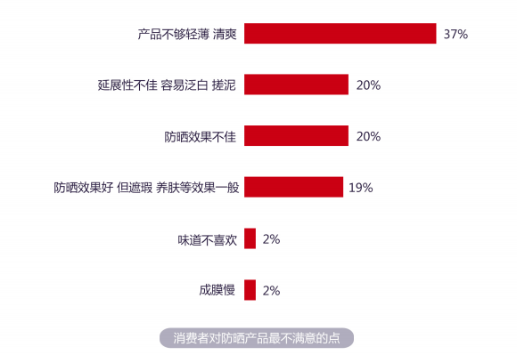 報告顯示,對防曬產(chǎn)品不滿意的消費者中,37%的認(rèn)為防曬產(chǎn)品不夠輕薄、清爽,同時BA們收到的客訴也包含了這一點,52.5%的BA反映顧客認(rèn)為防曬產(chǎn)品不夠清透,有厚重感或容易悶痘。如今的消費者崇尚打造“零負(fù)擔(dān)”的妝容,輕薄透氣、不油膩的防曬產(chǎn)品,或?qū)⒏呤袌鰸摿Α?/p>