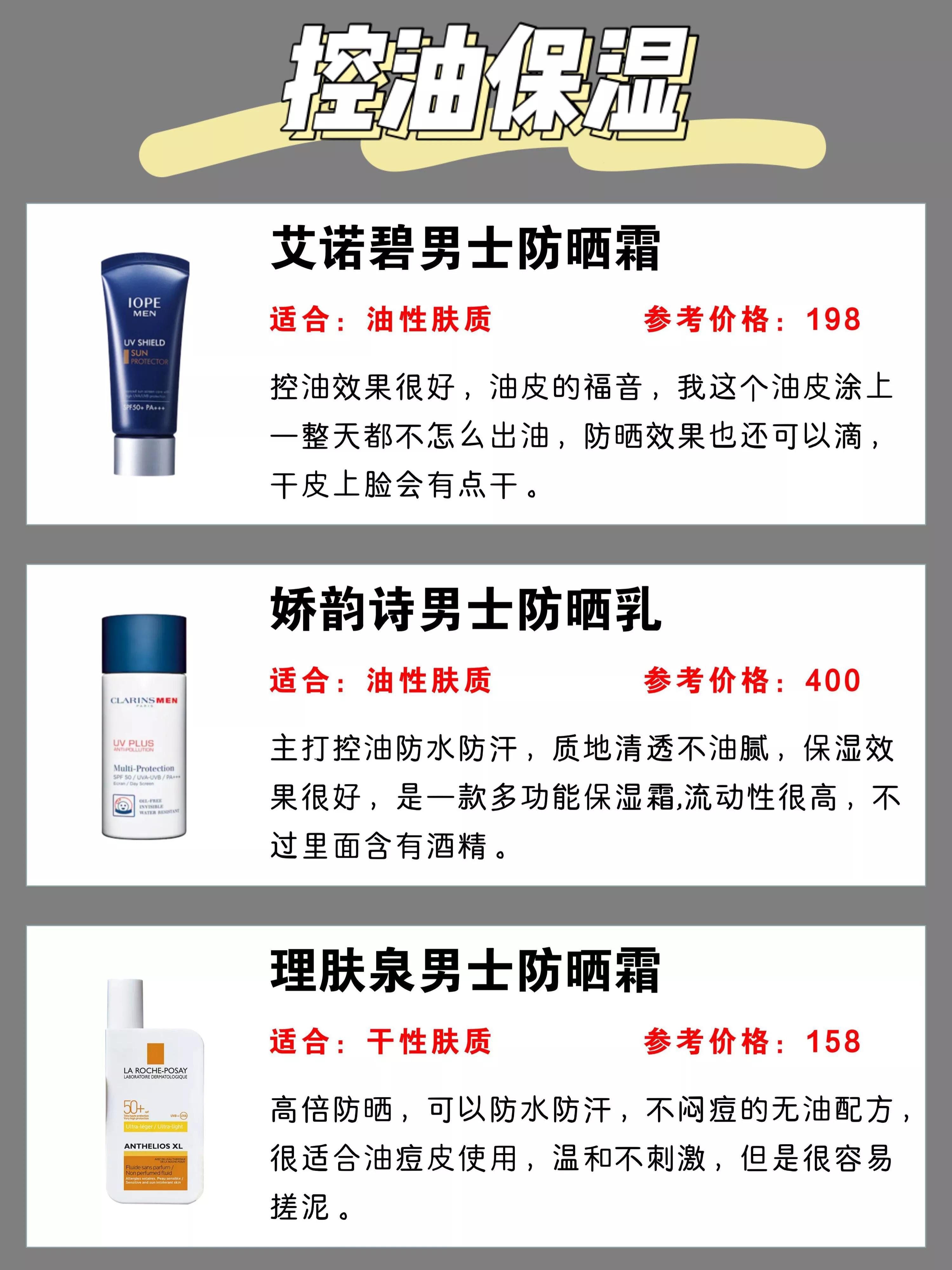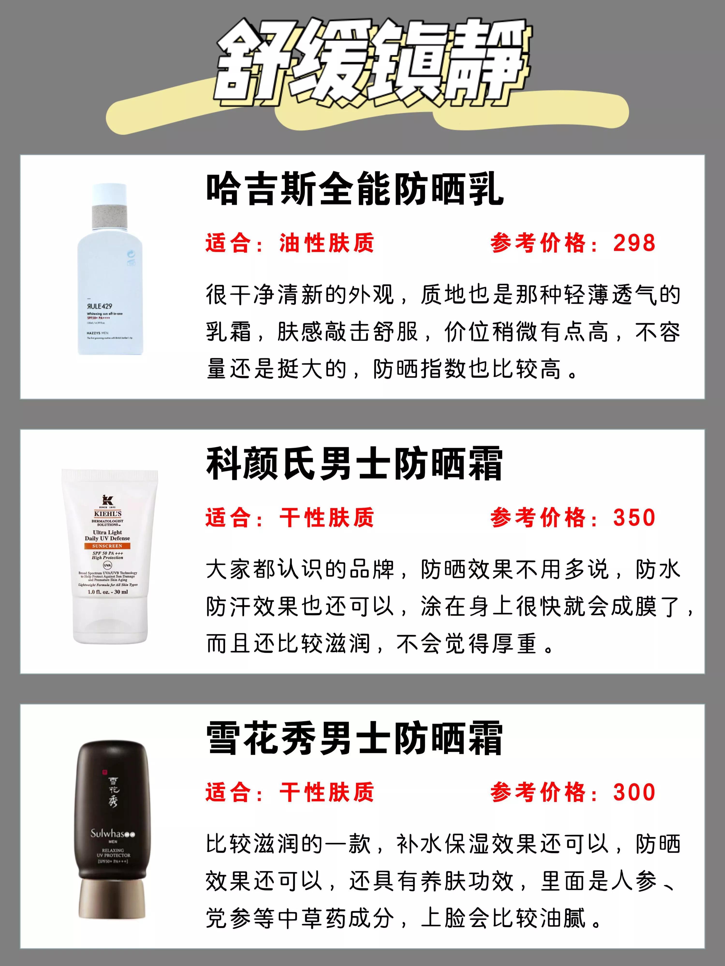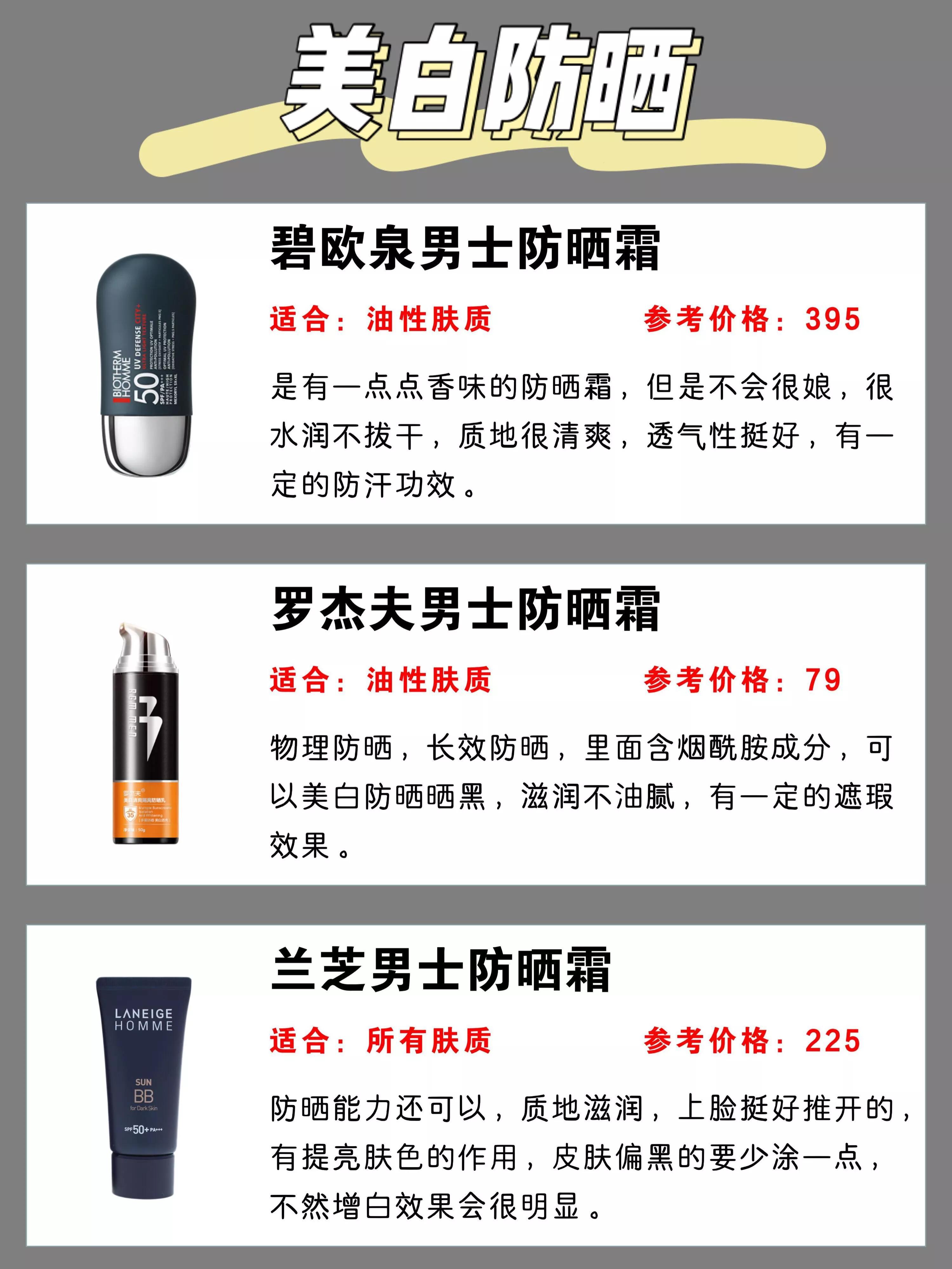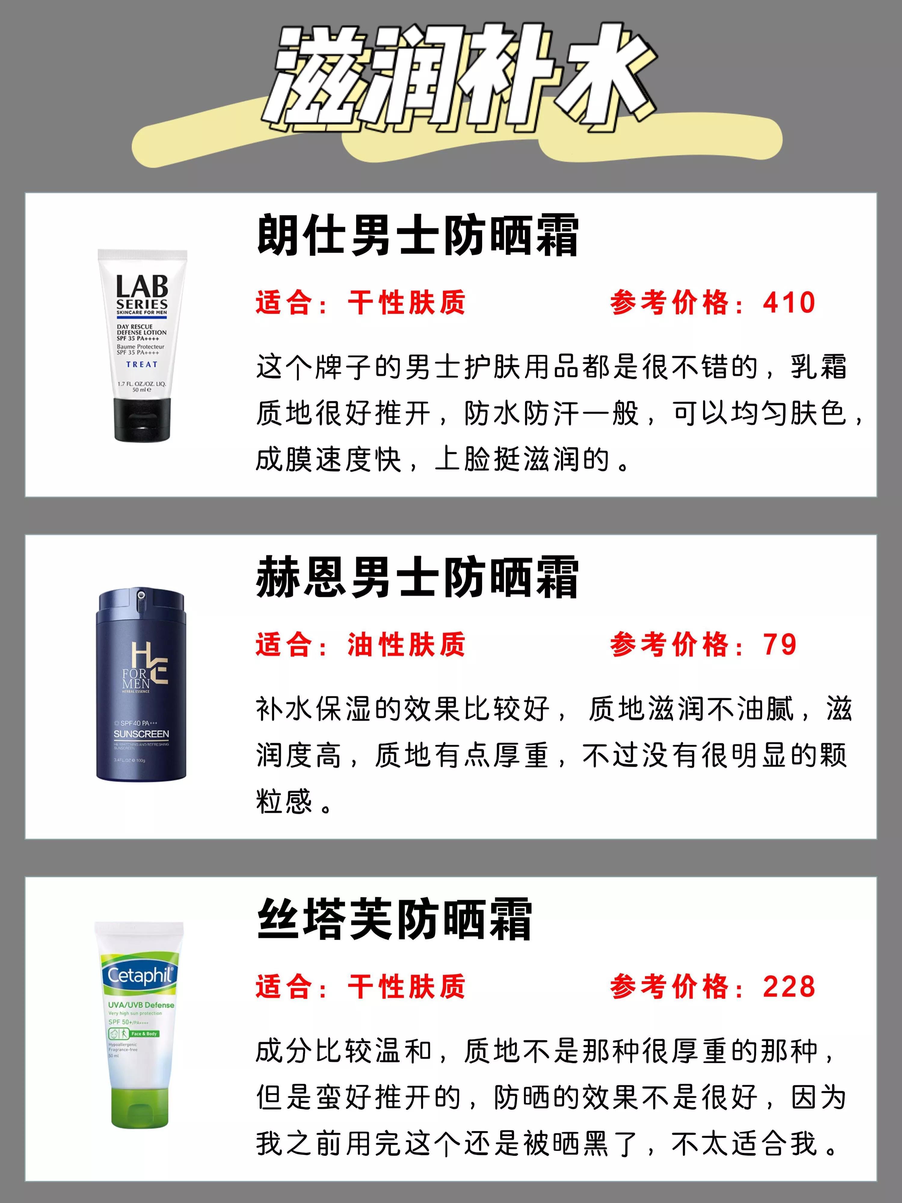 1、LISSAGE MEN防曬霜。嘉娜寶旗下的男士護(hù)膚品牌,乳液質(zhì)地,采用ADVAN深度紫外線損傷屏障技術(shù),讓防曬涂抹見均勻分布于皮膚上,同時(shí)讓霜體質(zhì)地更細(xì)膩,透明度更高,清爽,不泛白,不黏膩。物化型防曬,添加蘆薈提取物、西梅提取物、綠茶提取等多種植物精華;另外,清新香味也來自100%天然精油,并不含香精,不含礦物油,完全不擔(dān)心致痘。2、paul stuart 防曬霜(防水)。這牌子國內(nèi)比較陌生,高絲的男士護(hù)理品牌,針對男士戶外活動(dòng)多的特點(diǎn),擁有高防護(hù)值,和強(qiáng)的防水防汗力,無論什么場景,時(shí)刻保護(hù)皮膚免受強(qiáng)紫外線的傷害,同時(shí)防止暴露年齡的斑點(diǎn)。分層的涂改液質(zhì)地,質(zhì)地清爽不泛白,清新舒適的使用感。添加男士護(hù)膚成分:橡木提取物、綠茶提取物、茴香提取物等;不用卸,潔面膏就能洗掉,微香型的清新柑橘味。