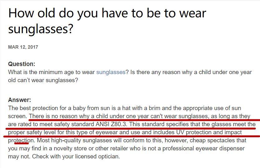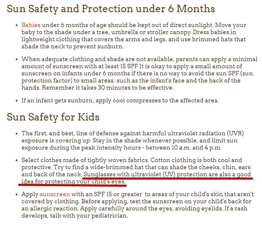 榮媽又翻了一下美國眼科學(xué)會(AAO)的官網(wǎng),他們也表示:一歲以下的孩子沒有理由不餓能佩戴太陽鏡,只要他們復(fù)合眼鏡使用的適當(dāng)?shù)燃墸òㄗ贤饩€防護和沖擊保護)就行。