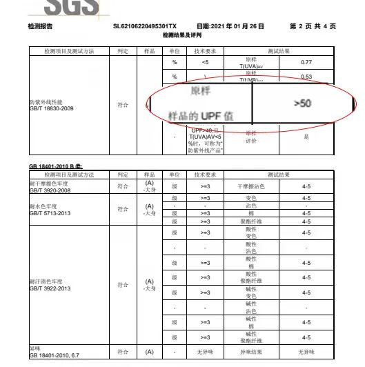 經(jīng)過檢測,紫外線防護(hù)系數(shù)>50(即50+),符合《防紫外線性能的評定》的規(guī)定。