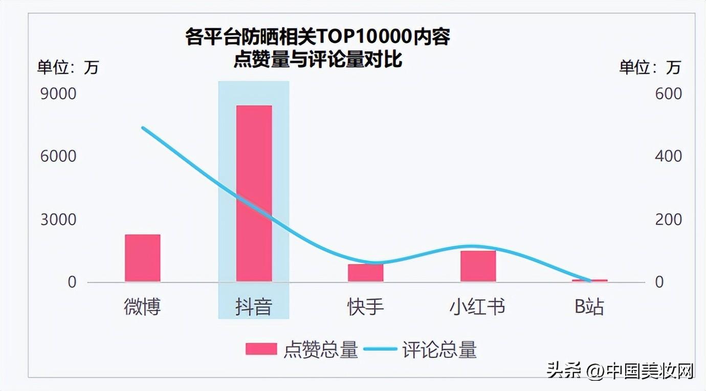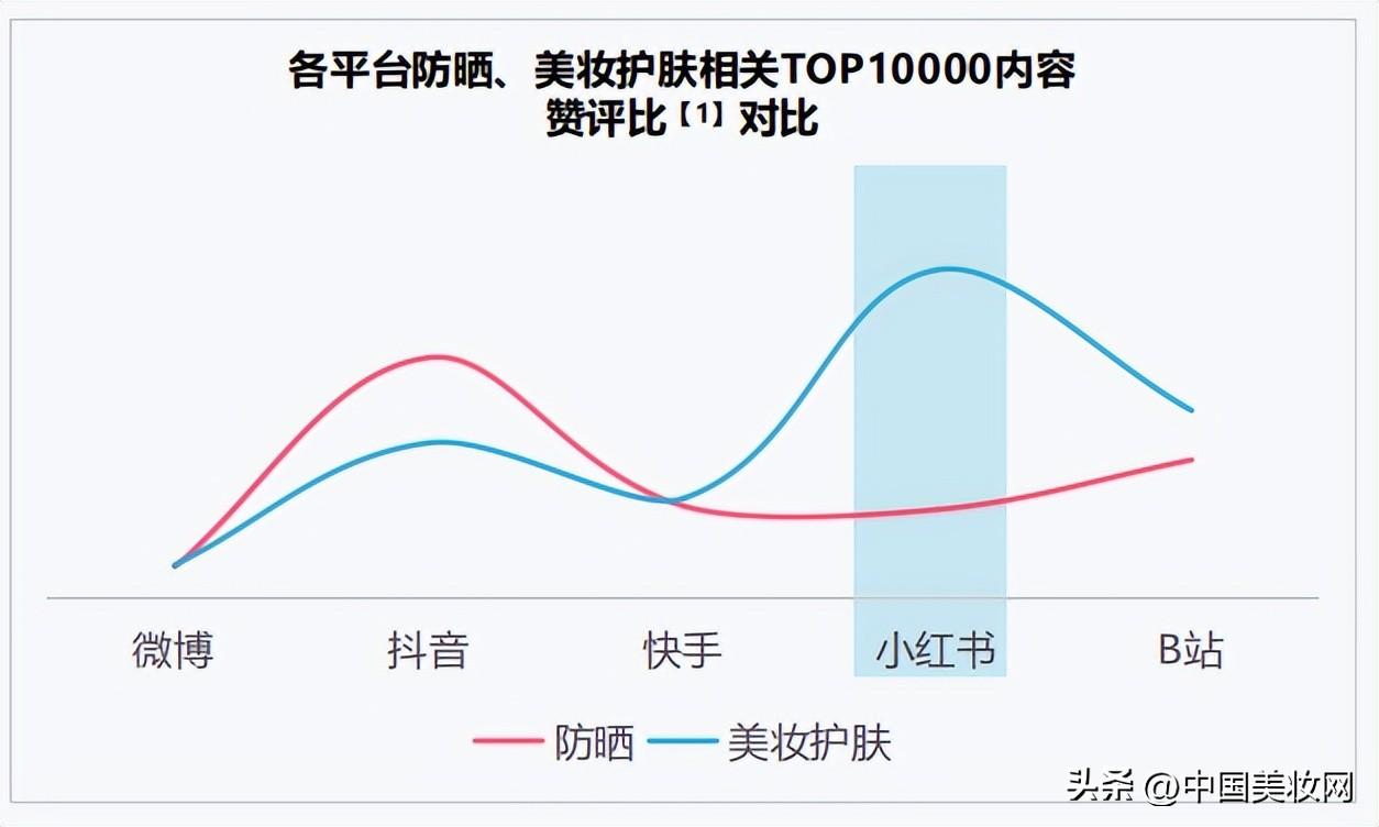 而從各平臺防曬與“美妝護膚”大類贊評比對比發(fā)現(xiàn),小紅書、B站在“防曬”細分內(nèi)容上的贊評比更低,這意味著兩大平臺用戶更傾向于在評論區(qū)互動,利于品牌進行私域流量轉化。