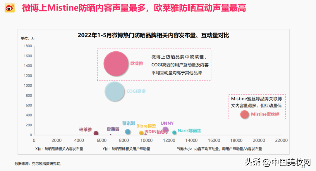 以歐萊雅在微博渠道的布局為例。除了在明星代言上制造熱點話題進行流量曝光,還通過與不同粉絲量級、不同類型、不同地域的KOL進行廣泛傳播。值得一提的是,2022年歐萊雅還通過多圈層營銷進行垂直滲透,比如在體育營銷上,合作馬龍(乒乓球運動)、程爽(滑雪運動)、陳佩娜(帆板運動)等多位運動,縱深滲透體育運動各細分圈層,深化防曬與運動關聯(lián)度,實現(xiàn)品牌破圈。數(shù)據(jù)顯示,歐萊雅在微博防曬品牌用戶互動量及內(nèi)容平均互動量均高于其它品牌。