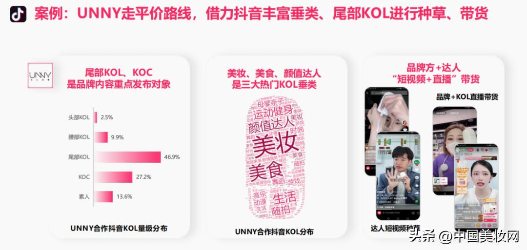而本土國貨品牌如薇諾娜、自然堂、UNNY,作為成長型品牌,它們的營銷重心在于建立品牌形象,擴大品牌聲量。而在國貨崛起的浪潮下,同樣需要聚集Z世代群體的消費力量,因此,這類品牌主要布局抖音、小紅書、B站渠道。比如深耕抖音渠道的UNNY,就依托KOL“短視頻+直播”進行雙向驅動,借力抖音豐富垂類、尾部KOL進行種草、帶貨。