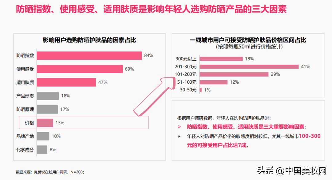 對于年輕人而言,防曬產(chǎn)品是否值得購買,主要考慮三個因素:防曬指數(shù)、使用感受與適用膚質(zhì)。在消費升級的大背景下,年輕人對于價格的敏感度降低,而對于產(chǎn)品功閾值則愈發(fā)拔高,報告顯示,一線城市100-300元可接受用戶占比達到7成,這意味著,產(chǎn)品品質(zhì)成為防曬市場消費的主要方向。