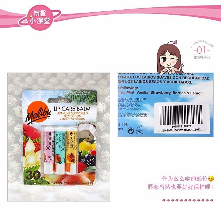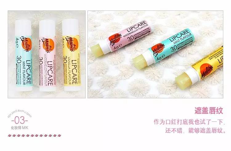 夏天防曬千萬被忽視了唇部的防曬,不然唇部色素沉淀涂什么唇膏都不好看!用一支帶有防曬功能的潤唇膏合適不過了~Malibu的高保濕防曬潤唇膏有西瓜、薄荷、香草三種味道,包裝走清新路線,香味也是淡淡的,比較天然。滋潤度挺不錯的,喜歡它不會顯得油膩,特別適合作為口紅的打底。在成分上看,都天然和,號稱孕婦和小孩都能用~