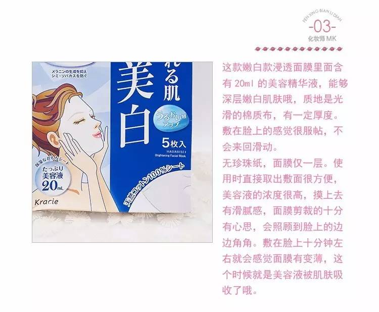 肌美精的面膜就不用多說了,范冰冰家里都是一箱一箱地囤著用的,MK之前去東京的時候掃了十幾盒回來,被辦公室的妹紙一掃而空。使用感受都是棒棒的,而且她們自己也在不斷回購。我自己也留了一盒,用了之后確實會有更有彈性,皮膚的透明感大大增強!這樣的皮膚,上個BB霜就很舒服啦~