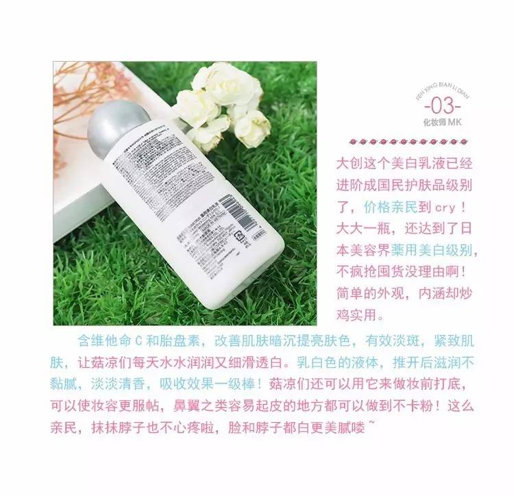 在粉星便利店里的美白乳液!這款乳液含有維C和胎盤素,十分保濕又美白!不少妹紙在做護膚的時候會忽略脖子和身體,導(dǎo)致色差嚴(yán)重。用大創(chuàng)來拯救脖子就是很不錯的選擇!白菜又大碗,用起來一點都不心疼!(MK就是因為用了大創(chuàng)導(dǎo)致脖子比臉白也是醉...)