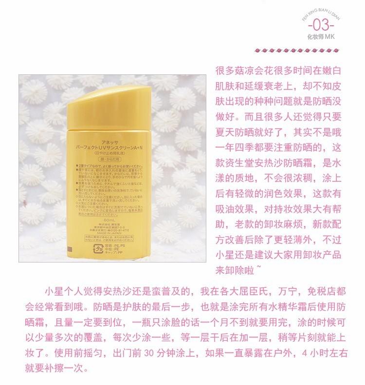 大名鼎鼎的資生堂安耐曬金瓶,因為“安耐曬”正名字被人在大陸惡意搶注了,它只好換了名字“安熱沙”。這個防曬是粉星榜的第一名,用它,絕!對!曬!不!黑!這個防曬出門旅游、上山下海是必備的,紫外線輻射強的地方就更有必要使用高倍數(shù)防曬。這一款是含有酒精成分,日系里頭的很多防曬都有這個成分,因為可以幫助防曬快速成膜,對酒精敏感或者皮膚比較干的妹子不建議用這一款,皮膚偏油的妹子則推薦使用。