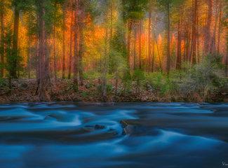 上圖圖片說明:這張照片,是我在Tunnel view拍完優(yōu)山美地日出這張照片后,在開車回去路上發(fā)現(xiàn)的一處景色,當(dāng)時(shí)日出后不到一個(gè)小時(shí),光線還不是很強(qiáng),日出暖暖的陽光直接灑在遠(yuǎn)處的五彩林,很是絢麗迷人,跟小溪旁邊的暗處的樹林形成了明暗的對(duì)比,小溪的里面的石頭檔住了水流,為了突出這水流的質(zhì)感,我當(dāng)時(shí)條件反射般使用了10檔的ND,使水流呈現(xiàn)絲綢狀,另外光線較弱的情況下,小溪發(fā)出淡淡的藍(lán)色,跟受陽光照射的五彩林的暖調(diào)形成了冷暖的對(duì)比。