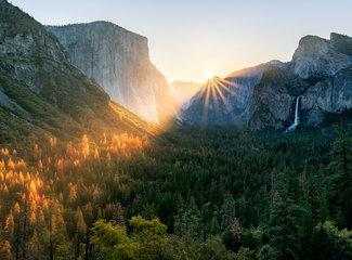 優(yōu)勝美地公園主要有四大景區(qū),呈F型分布,分別是位于中央的優(yōu)勝美地谷景區(qū)(Yosemite Valley)、山頂?shù)谋c(diǎn)景區(qū)(Gracier Point)、北側(cè)的第奧嘉景區(qū)(Tioga Pass)以及南端的瓦沃納景區(qū)(Wawona)。優(yōu)勝美地谷被稱為“無與倫比的山谷”,是世界典型的冰河山谷,有著的“U”型曲線,高山冰河緩緩流經(jīng)峽谷,在兩側(cè)留下陡峭的山谷與平坦的山谷底。山坡上的花崗巖受到融冰侵蝕作用的影響,留下了大塊巨硬無比的巖石,如酋長(zhǎng)巖(El Captain),高度約為1095米。許多年來,這里成為世界自由登山愛好者的天堂。半圓頂山(Half Dome)得名于它類似圓屋頂?shù)钠嫣赝庑危魏我晃坏巧秸呷绻軐⑺腥肱实怯涗?,一定?huì)擁有無比的成就感!熱門的景點(diǎn)還有冰川點(diǎn),這里擁有令人難忘的優(yōu)勝美地瀑布,落差高達(dá)740米,傲視整座山谷,是北美洲高的瀑布。在春天,公園里草木郁郁蔥蔥,針葉林與橡樹交織,營(yíng)造出與眾不同的氛圍,當(dāng)然南端的杉樹林也不容錯(cuò)過。