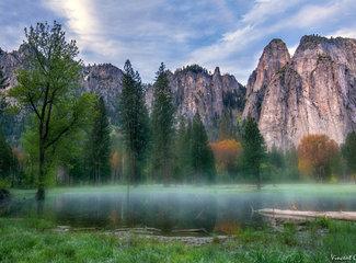 上圖圖片說明:早上,我趕在日出前從營(yíng)地出發(fā)去Tunnel view拍日出,但經(jīng)過Yosemite Villiage附近時(shí),我發(fā)現(xiàn)了這個(gè)小湖,晨霧還沒散去,當(dāng)時(shí)光線很柔和,那種朦朧之美立即吸引了我,立即架好三角架,拍了這張照片。