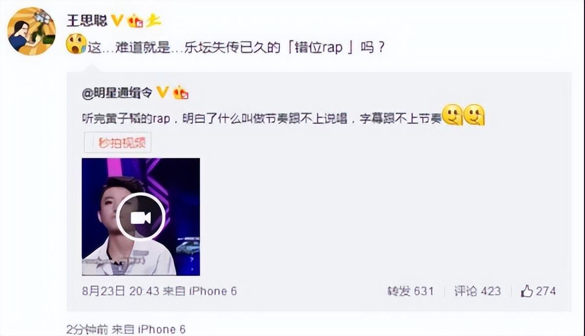 當(dāng)媒體發(fā)布了黃子韜唱rap的視頻之后,王思聰評論這是樂壇失傳已久的錯位rap。