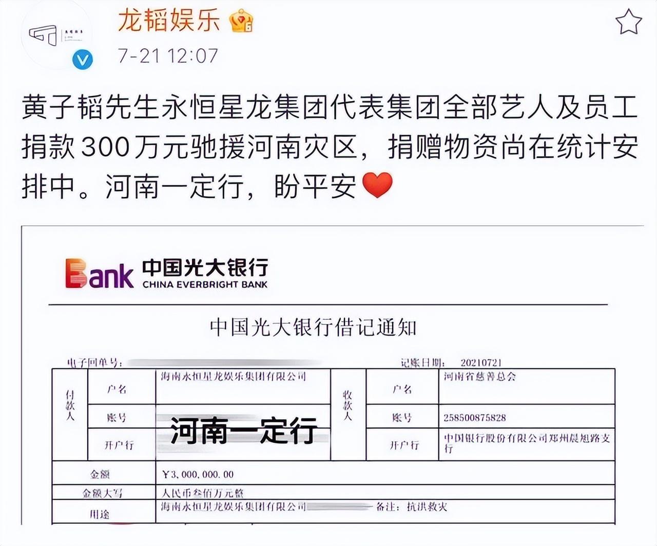 其中黃子韜就代表公司和個人的名義為河南捐助了300萬,并且下架了自己公司名下YKYB這一服裝品牌所有衣物馳援河南,單單是這些物資就價值200萬。