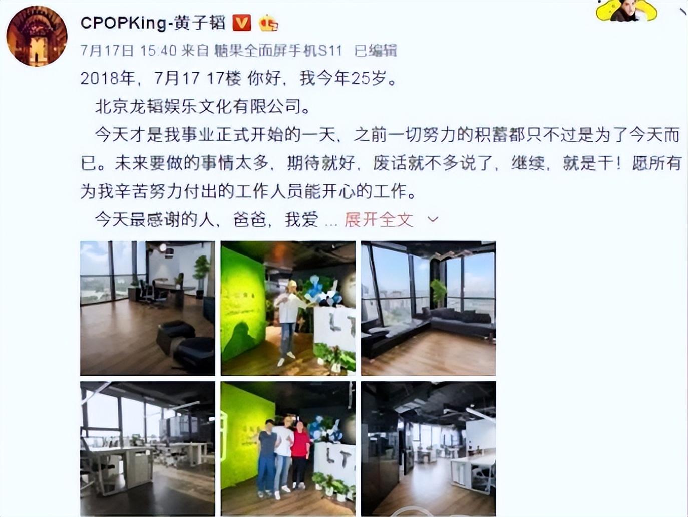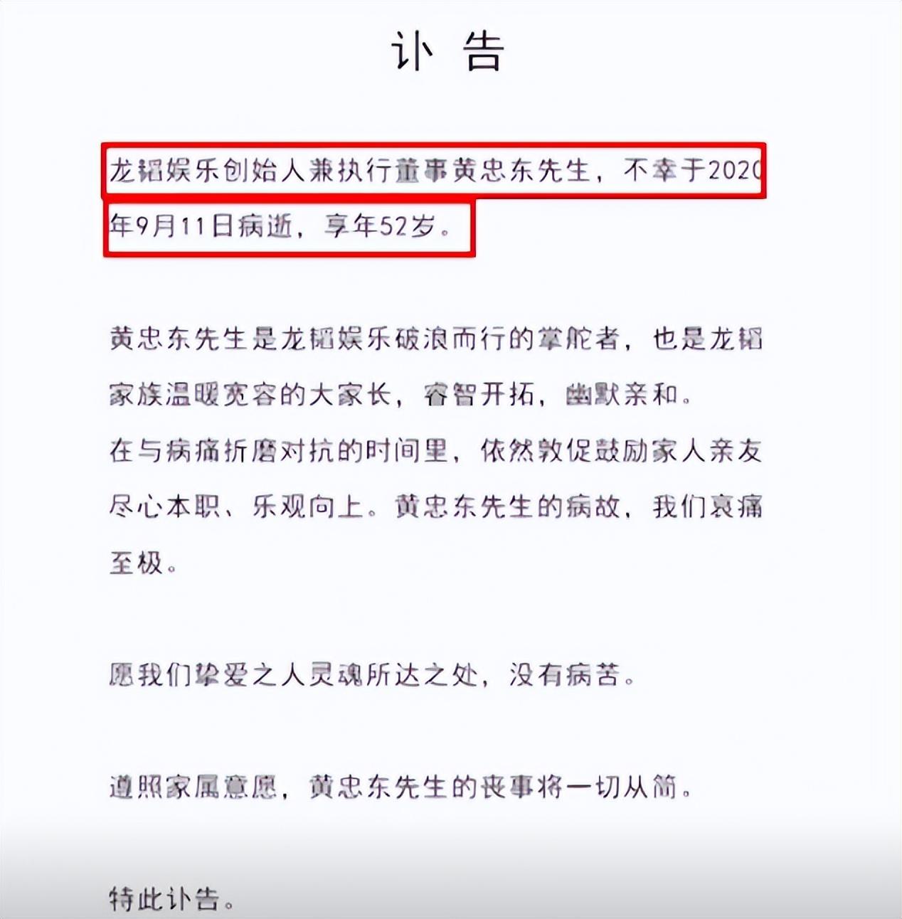 2020年9月11日龍韜娛樂公司突然發(fā)布了一則訃告,稱黃忠東先生因病去世,于是黃子韜成為了龍韜娛樂的一把手,他繼承了父親留下的200億遺產(chǎn),這也讓黃子韜的身價直線上升。