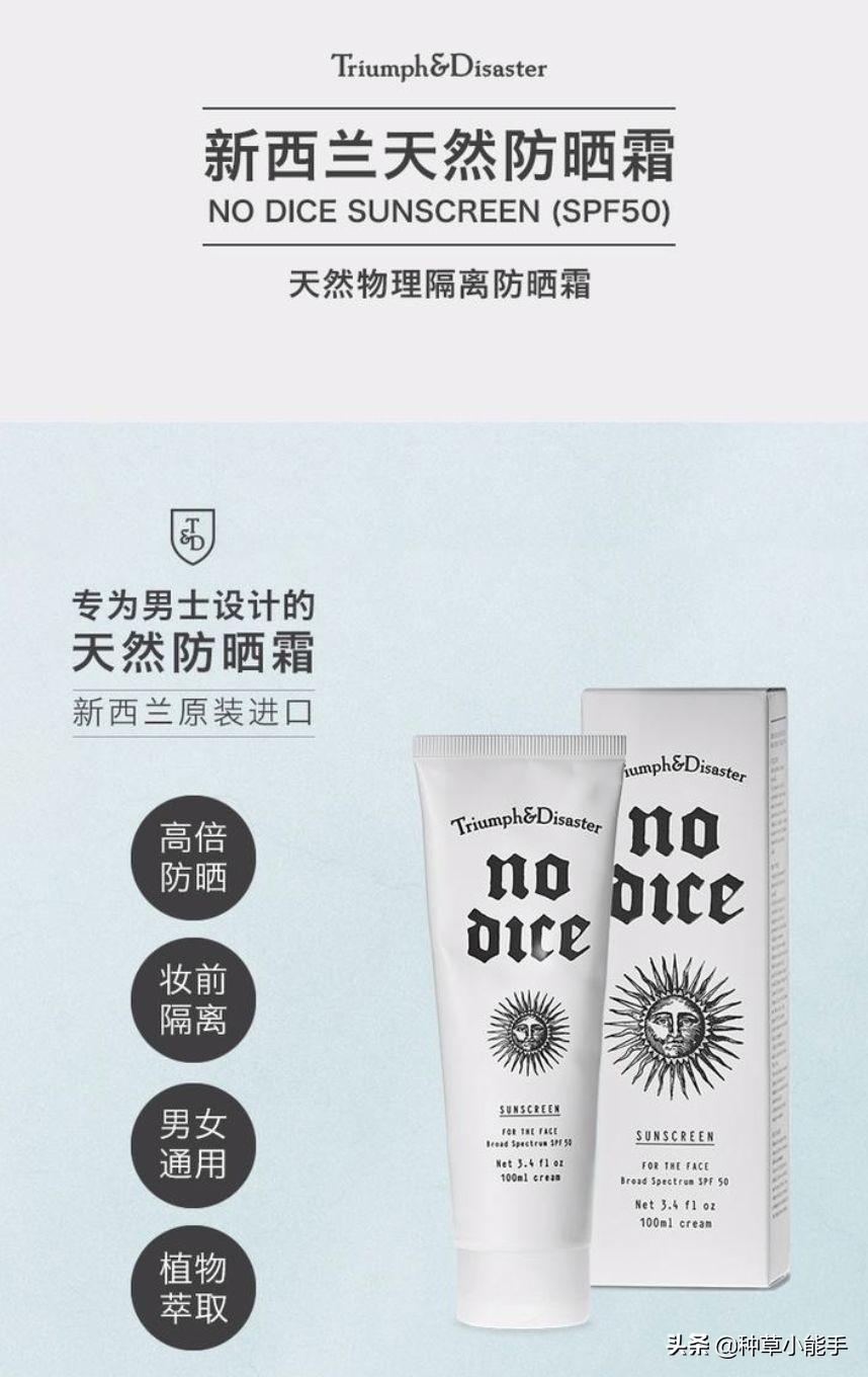 Triumph & Disaste獨特的防曬配方,一方面有著高的物理防曬成份,另一方面有多種滋潤肌膚的自然萃取物,使得No Dice不僅僅作為一款好用的防曬霜,還被用作肌膚隔離霜,作為日常肌膚護理,以及妝前打底使用。(男女可用)