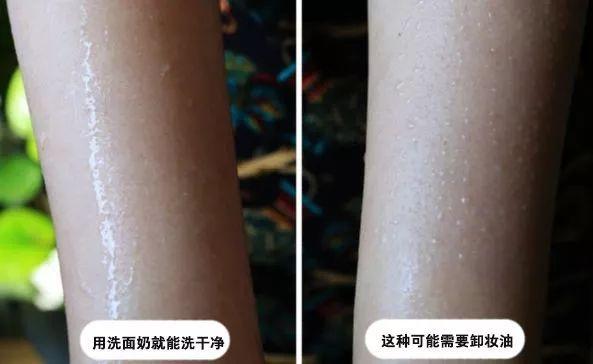 再嘮叨一下,防曬霜要3小時(shí)左右擦一次,臉部用量擠到手心一枚硬幣大小,擦太少起不到防嗮果不能省,并且有些防曬霜是需要卸妝的,下圖右邊擦了防水性的防曬霜,用水洗的時(shí)候發(fā)現(xiàn)手臂上有很多小水珠,說(shuō)明還洗不干凈有所殘留,就需要進(jìn)一步清潔了