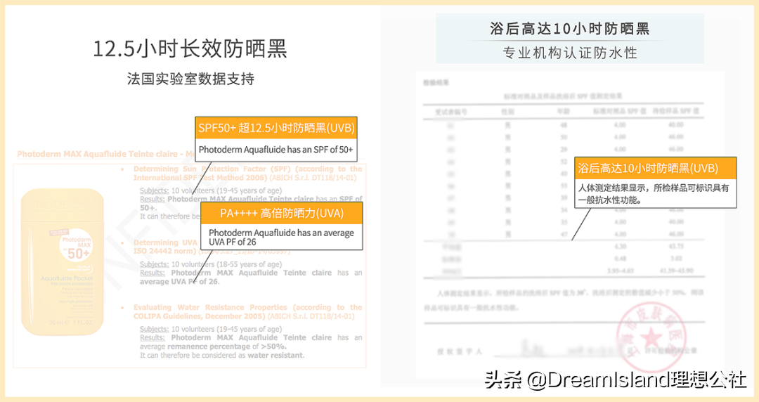 來跟我看一下它的防護性能:超長待機時間「12.5h防曬黑」(超過了理膚泉大哥大)+超強防水性能「沾水后10h仍有SPF40的防曬力」!感覺可以涂著它去熱帶沖瀑布了,果然專業(yè)實驗室品牌就是厲害啊