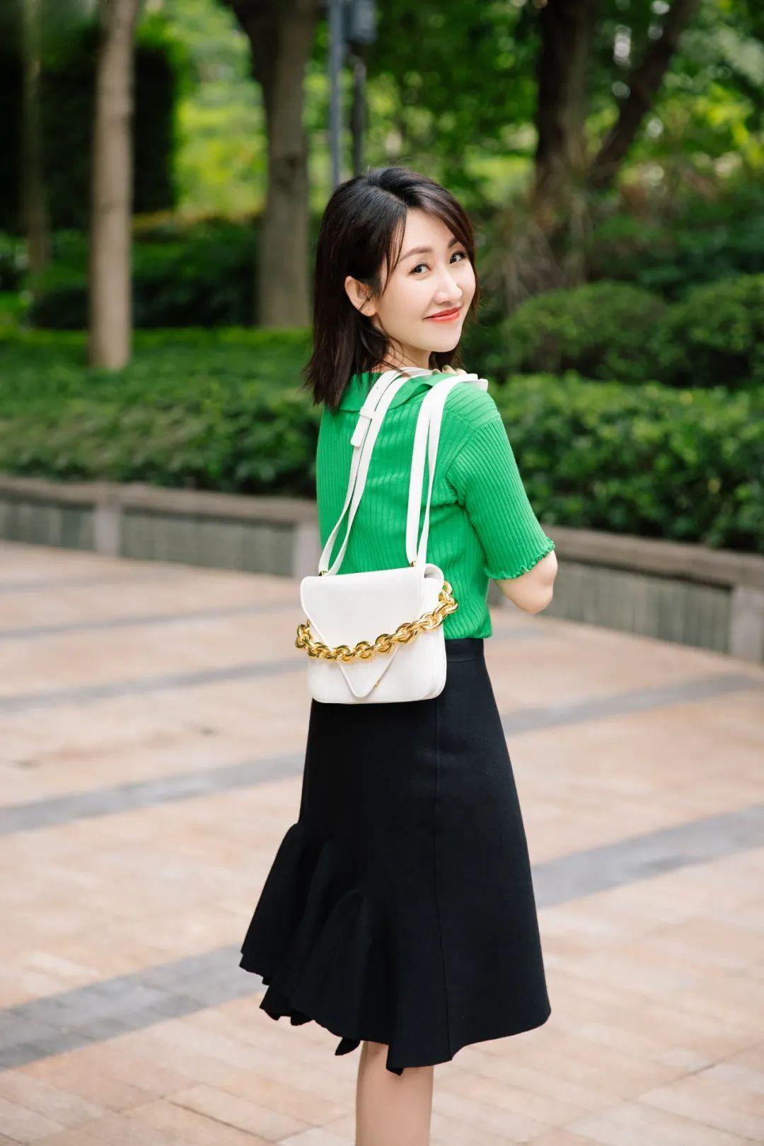 BV綠看起來飽和度很高,是那種看起來很不好駕馭的顏色,真正穿過后發(fā)現(xiàn)還挺百搭的,顯得人又白又有精神。多慮了~▼