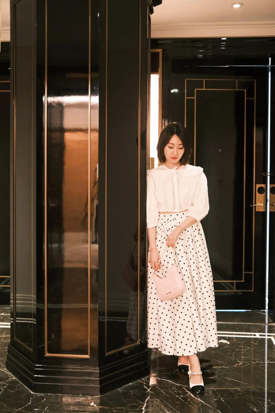LOOK 12:娃娃領(lǐng)襯衫+波點(diǎn)半裙+瑪麗珍鞋