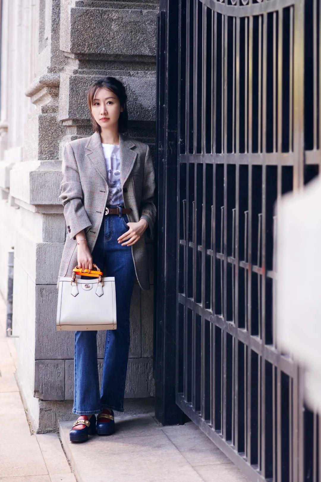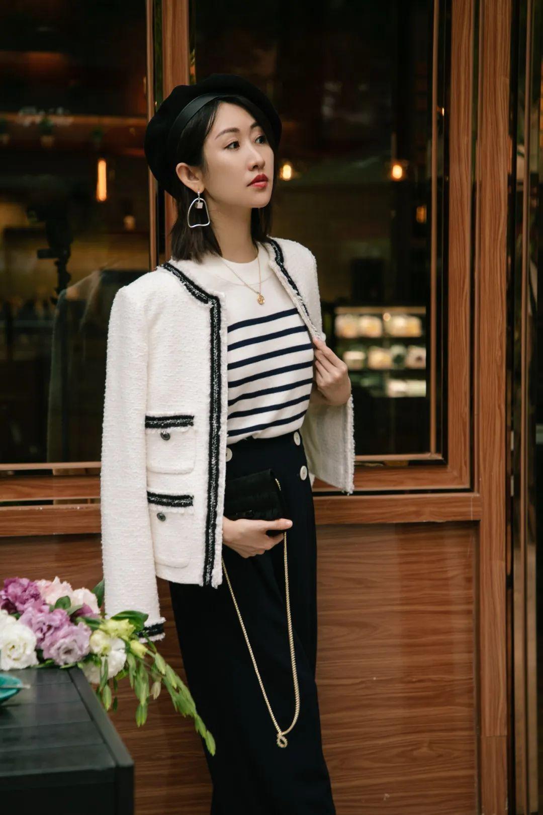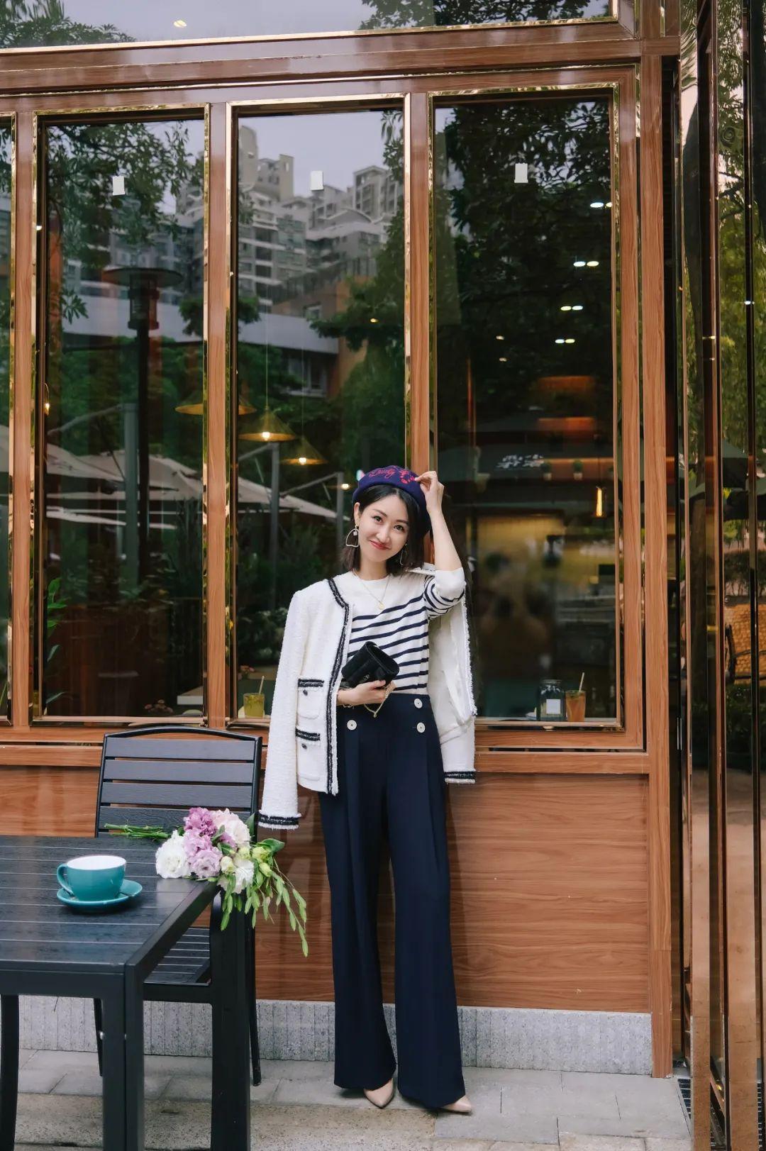 條紋衫配闊腿褲,再加上粗花呢外套,這是常見的法式風(fēng)穿搭套路啦。別忘了再加一頂貝雷帽。