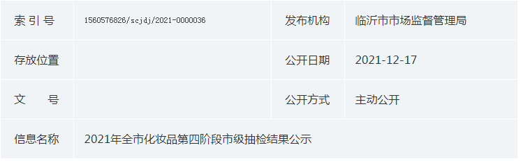 中國(guó)質(zhì)量新聞網(wǎng)訊 近日,山東省臨沂市市場(chǎng)監(jiān)管局公示2021年全市化妝品第四階段市級(jí)抽檢結(jié)果。 第四階段市抽工作中,共抽查了全市15家化妝品經(jīng)營(yíng)者,31批次產(chǎn)品。經(jīng)檢驗(yàn)結(jié)構(gòu)檢驗(yàn)監(jiān)測(cè),發(fā)現(xiàn)1批次不合格產(chǎn)品。