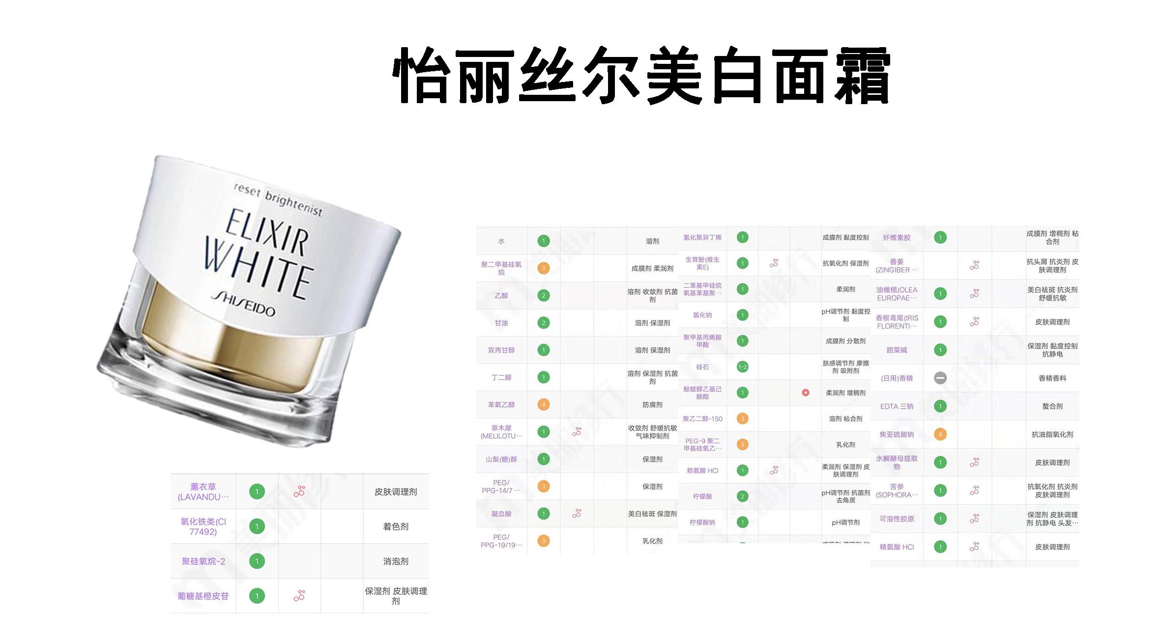 怡麗絲爾相對來說就比較典型了,是典型的“日系面霜”配方,如果熟悉小咔的就應(yīng)該懂了,小咔提到日系xxx就代表會有“乙醇(酒精)”的出現(xiàn),怡麗絲爾是資生堂旗下的品牌,防曬霜,水乳,都很出名,咱們在抗老面霜中也說過了怡麗絲爾的膠原蛋白面霜,結(jié)果一般,希望這款美白面霜,沒有給大家?guī)硎桑?/p>