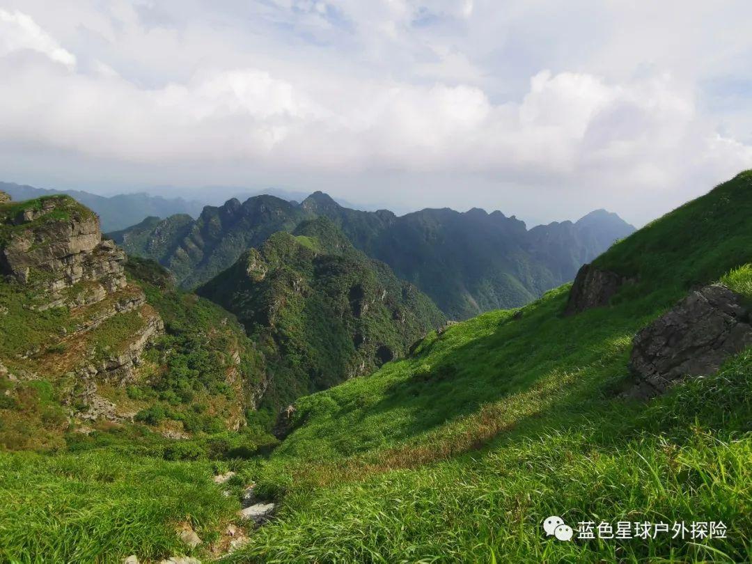 落日峰至高嶂頂,一路視野開闊:踏過的群山全在腳下,一覽眾山小,綠色的大草坡,像一幅美麗的巨大畫卷,跳躍在藍(lán)天白云下,不注意還以為來到了某個(gè)大草原。