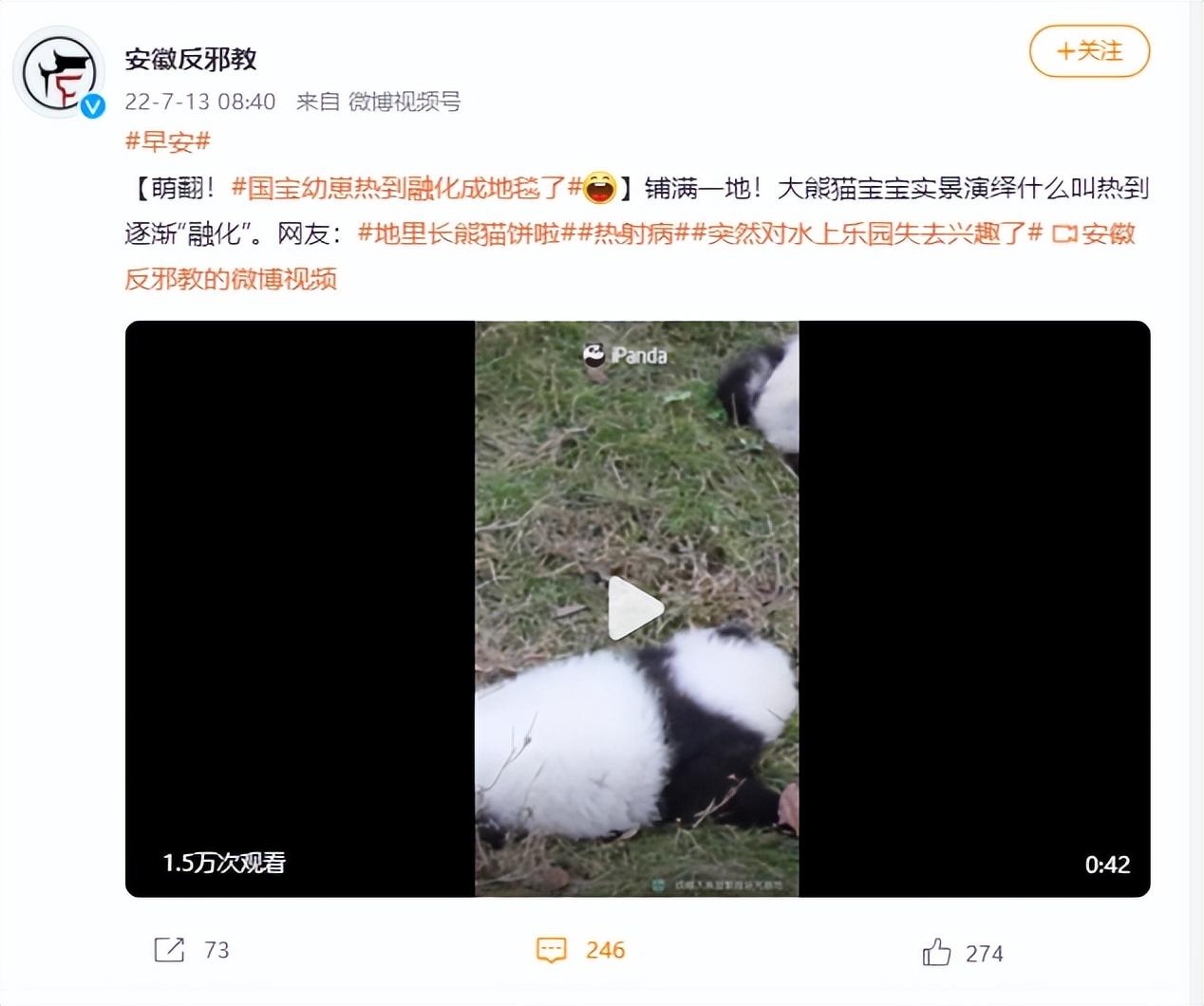 網(wǎng)上甚至有人曬出了視頻,“國(guó)寶幼崽熱到融化成地毯了”,網(wǎng)友紛紛表示:“有被萌到”、“地里長(zhǎng)熊貓餅了”。