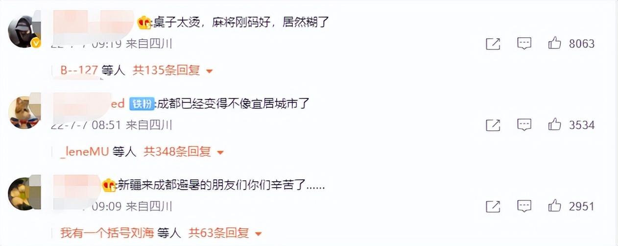 不過就算溫度再高,也阻止不了四川網(wǎng)友的樂觀天性。有四川網(wǎng)友自我調(diào)侃道:“我不開玩笑的說,昨條在外面拌了一份涼菜,提回去感覺吃的是冒菜”、“桌子太燙,麻將剛碼好,居然糊了”、“新疆來成都避暑的朋友們你們辛苦了……”
