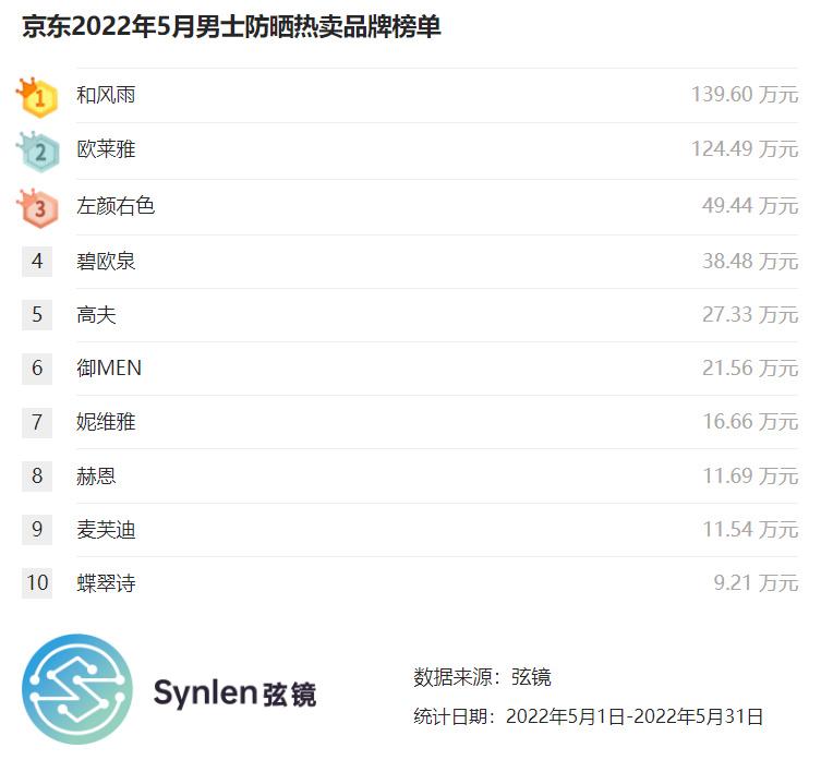 根據(jù)電商數(shù)據(jù)搜索工具——“弦鏡”數(shù)據(jù)顯示,京東平臺(tái)2022年5月男士防曬熱賣品牌榜單,第一名和風(fēng)雨,銷售額為139.60萬元。第二名歐萊雅,銷售額為124.49萬元。第三名左顏右色,銷售額為49.44萬元。從第四名到第十名分別為碧歐泉、高夫、御MEN、妮維雅、赫恩、麥芙迪、蝶翠詩。
