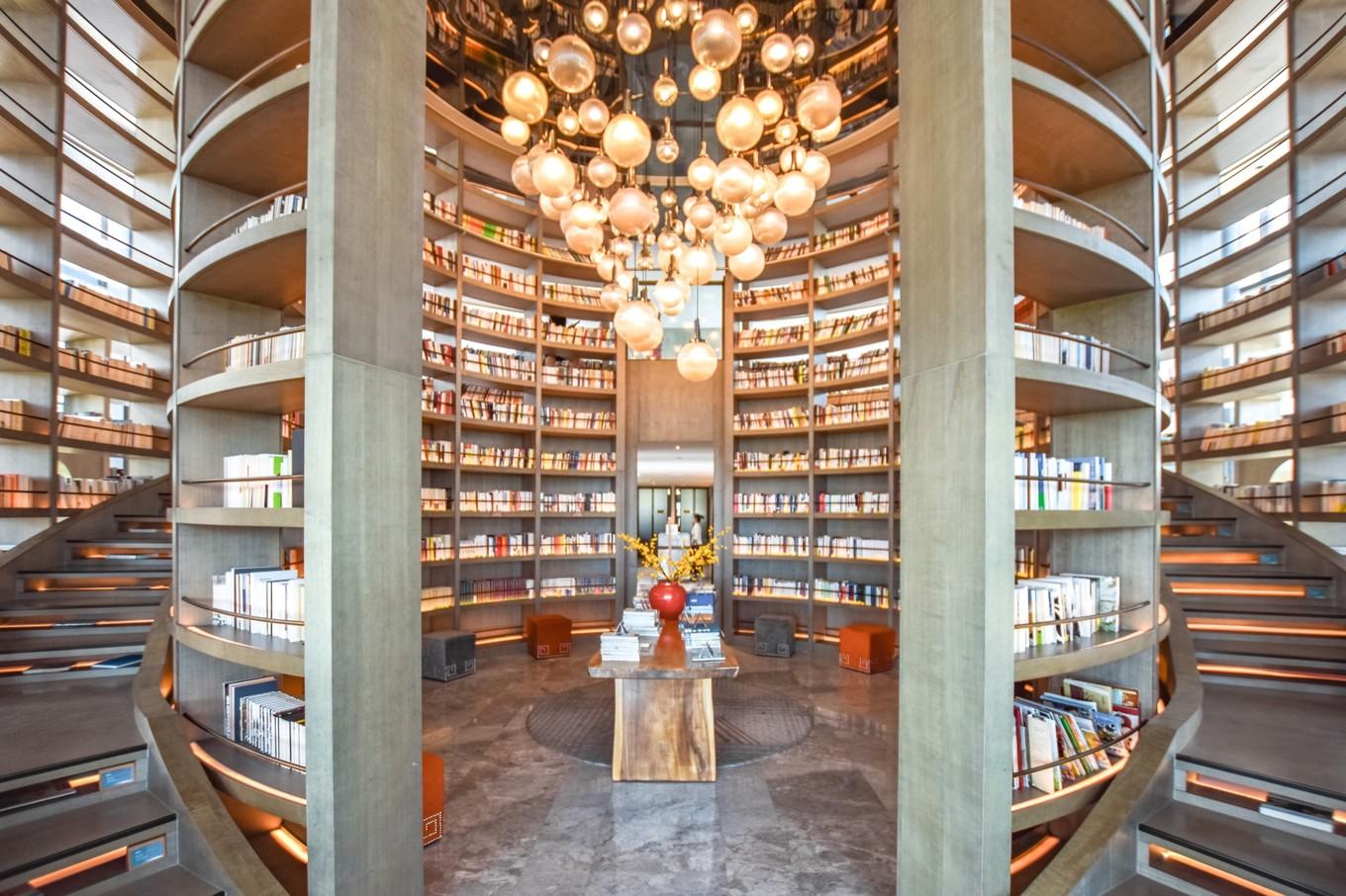 進(jìn)來第一眼就看到了館內(nèi)那高高的圓筒環(huán)形書架,一直到頂,全擺滿了書籍,數(shù)不清有多少書籍,置身其中,就像被書海給包圍了,超有讀書氛圍的。